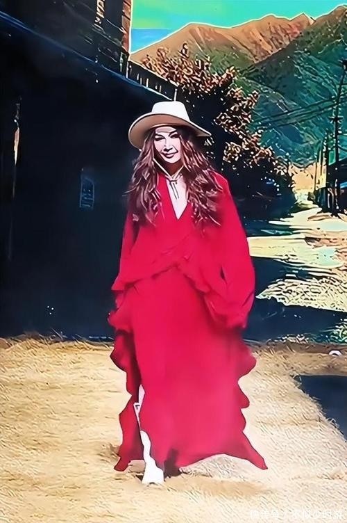 她身穿红色深V长裙,搭配波浪卷发与宽檐帽,整体装扮极具视觉冲击力。